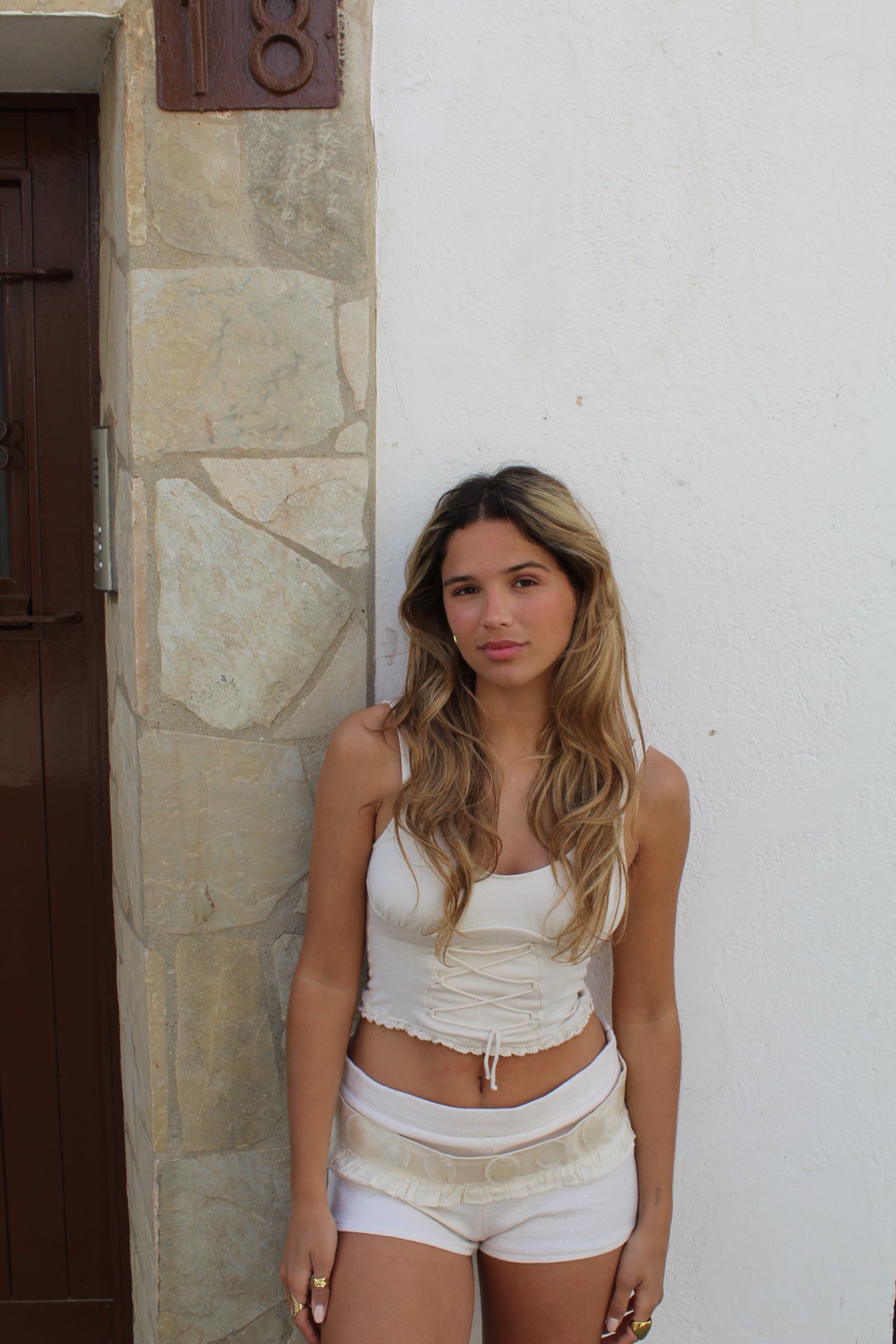 Eivissa Belt es un cinturón ancho de loneta con un delicado volante en la parte inferior, adornado con redondas de nácar natural.